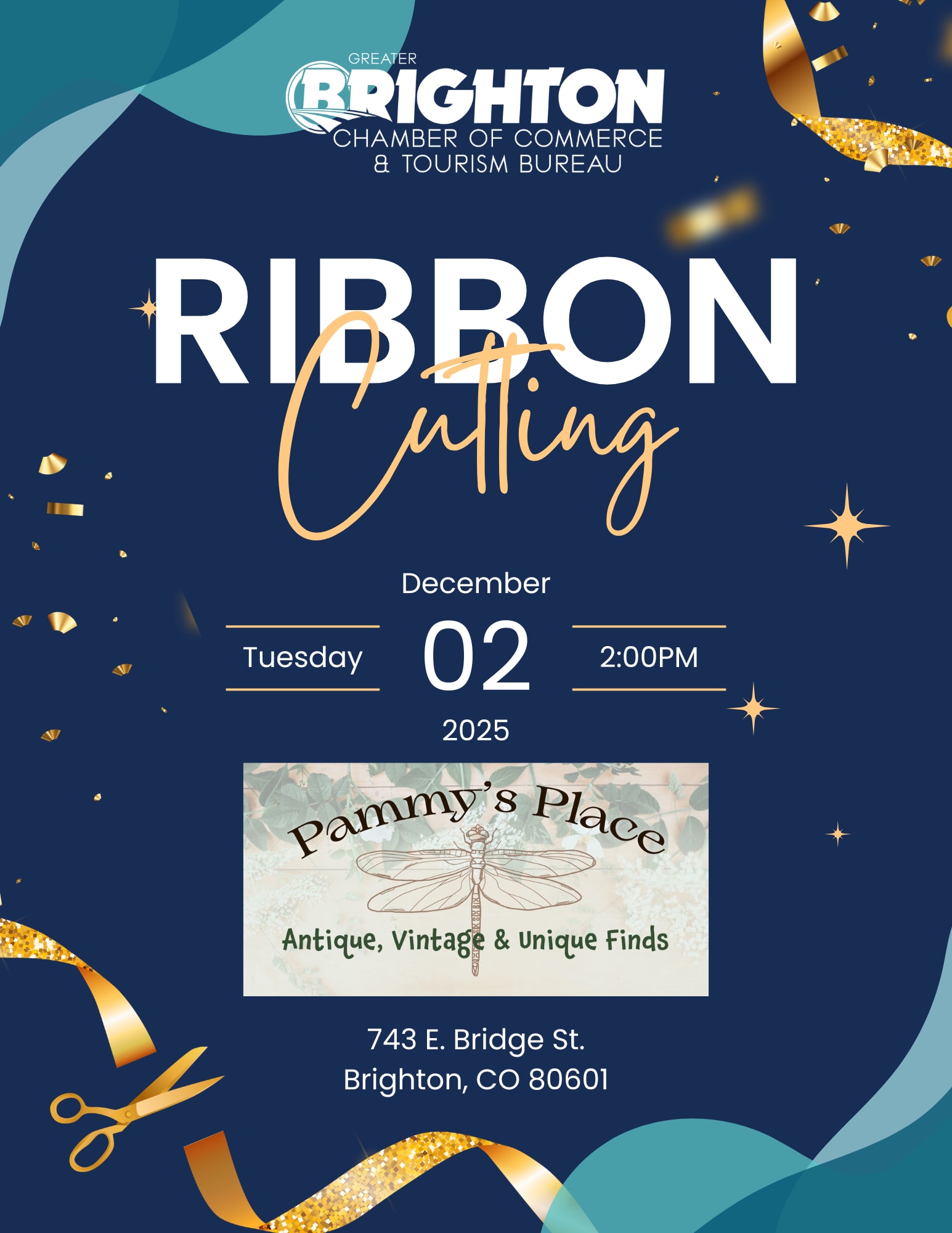 ✨ Ribbon Cutting at Pammy’s Place! ✂️ Join us on Tuesday, December 2nd at 2:00 PM as we welcome Pammy’s Place – Antique, Vintage & Unique Finds to the Brighton business community! Located at 743 E. Bridge St., Brighton, CO 80601, Pammy’s Place offers a charming selection of antiques, vintage décor, and one-of-a-kind treasures you won’t want to miss. Come celebrate their opening, meet the owner, and help us give them a warm Brighton Chamber welcome! 🎉